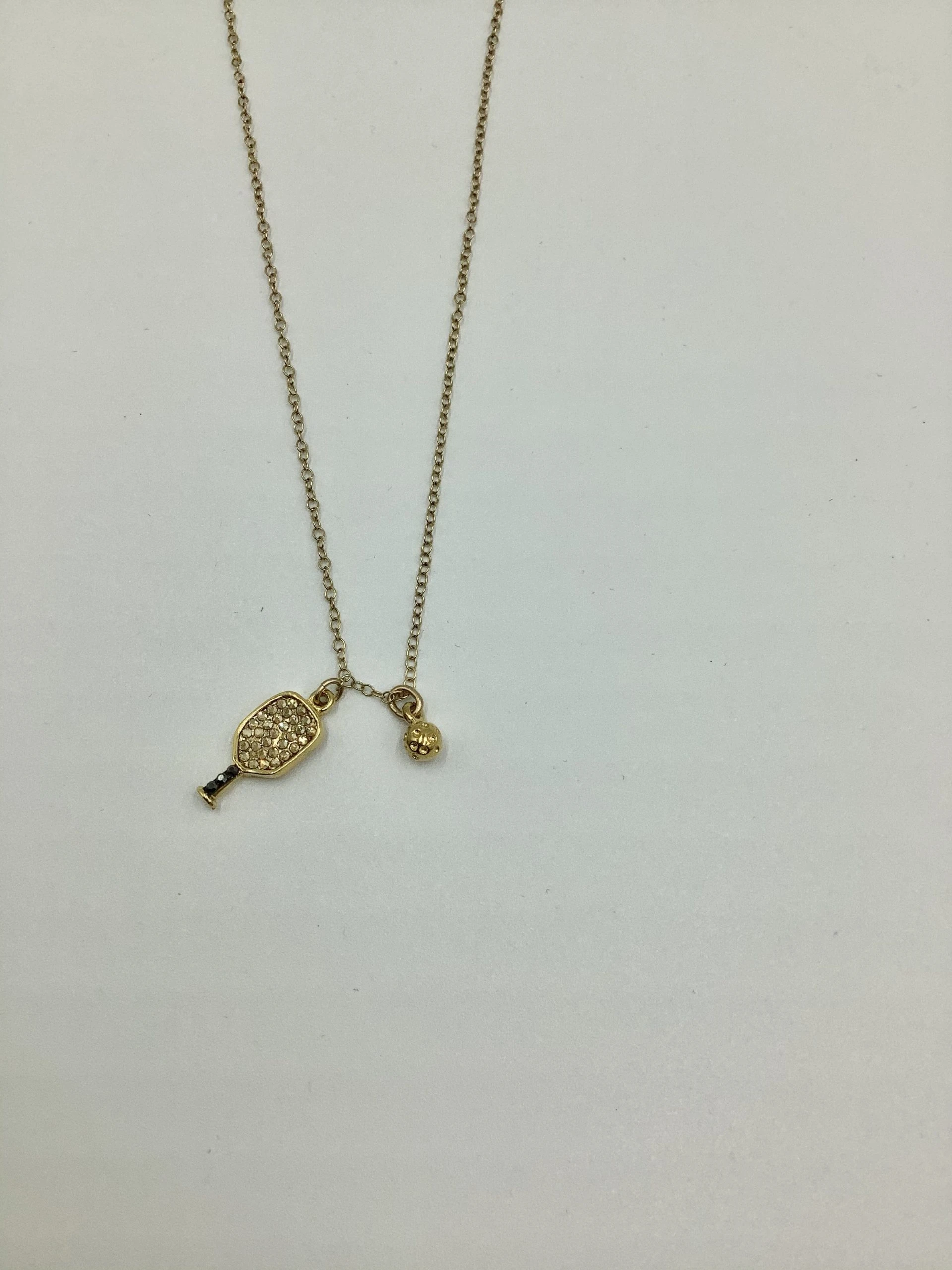Gold colored crystal pickleball paddle and ball on 16″ gold fill chain