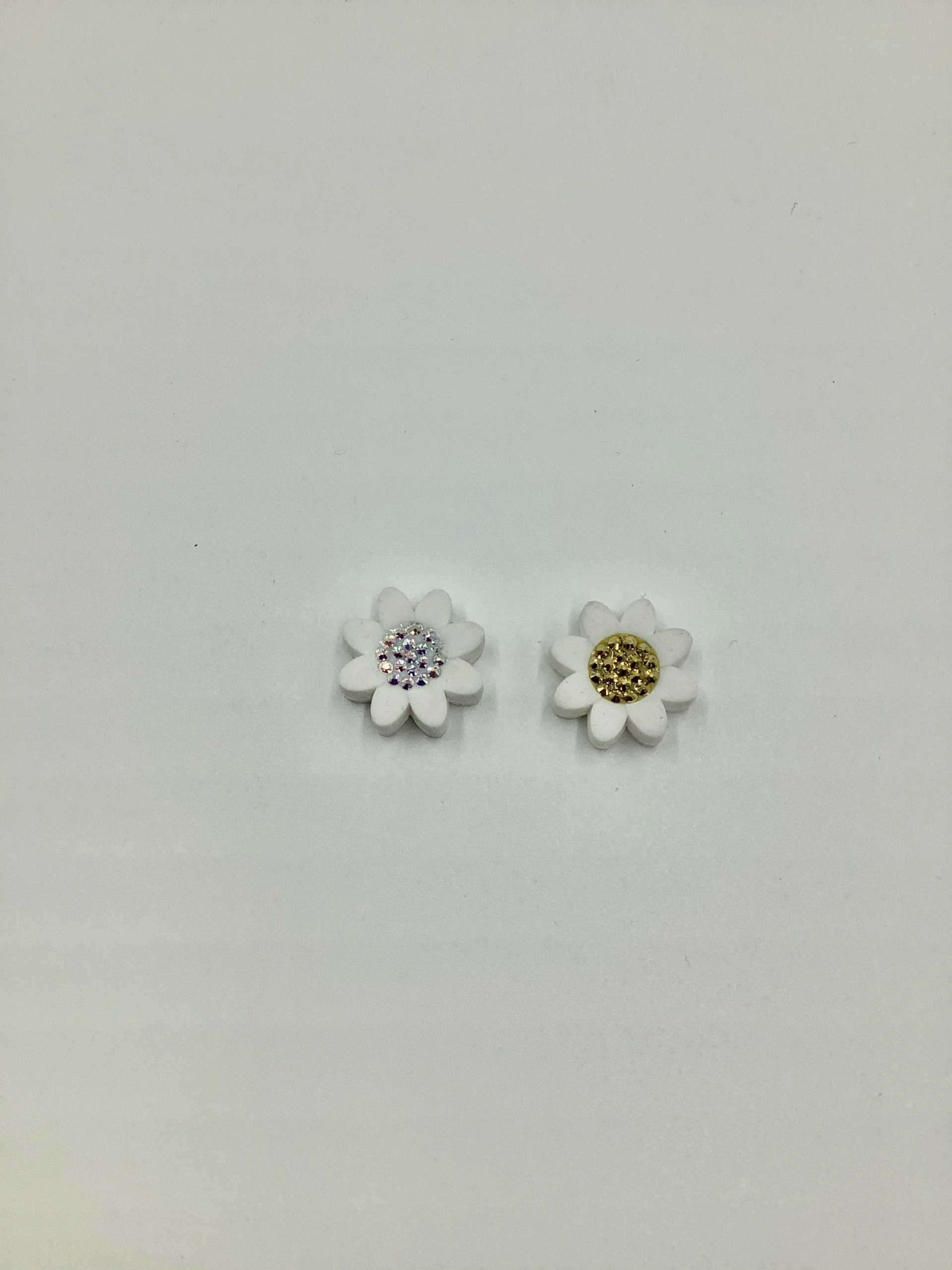 White flower dampener with crystal centers, silver on one side and gold on the other