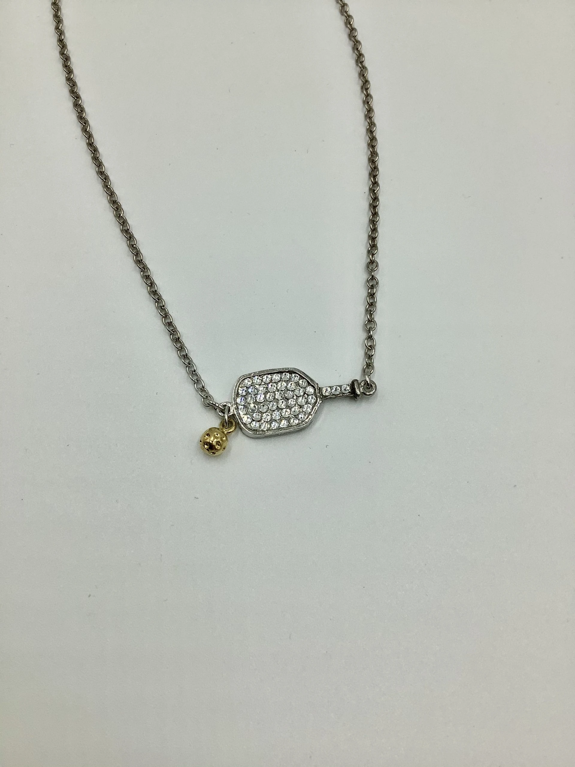 Sideways, Large crystal pickleball paddle and ball on 16″ sterling silver chain