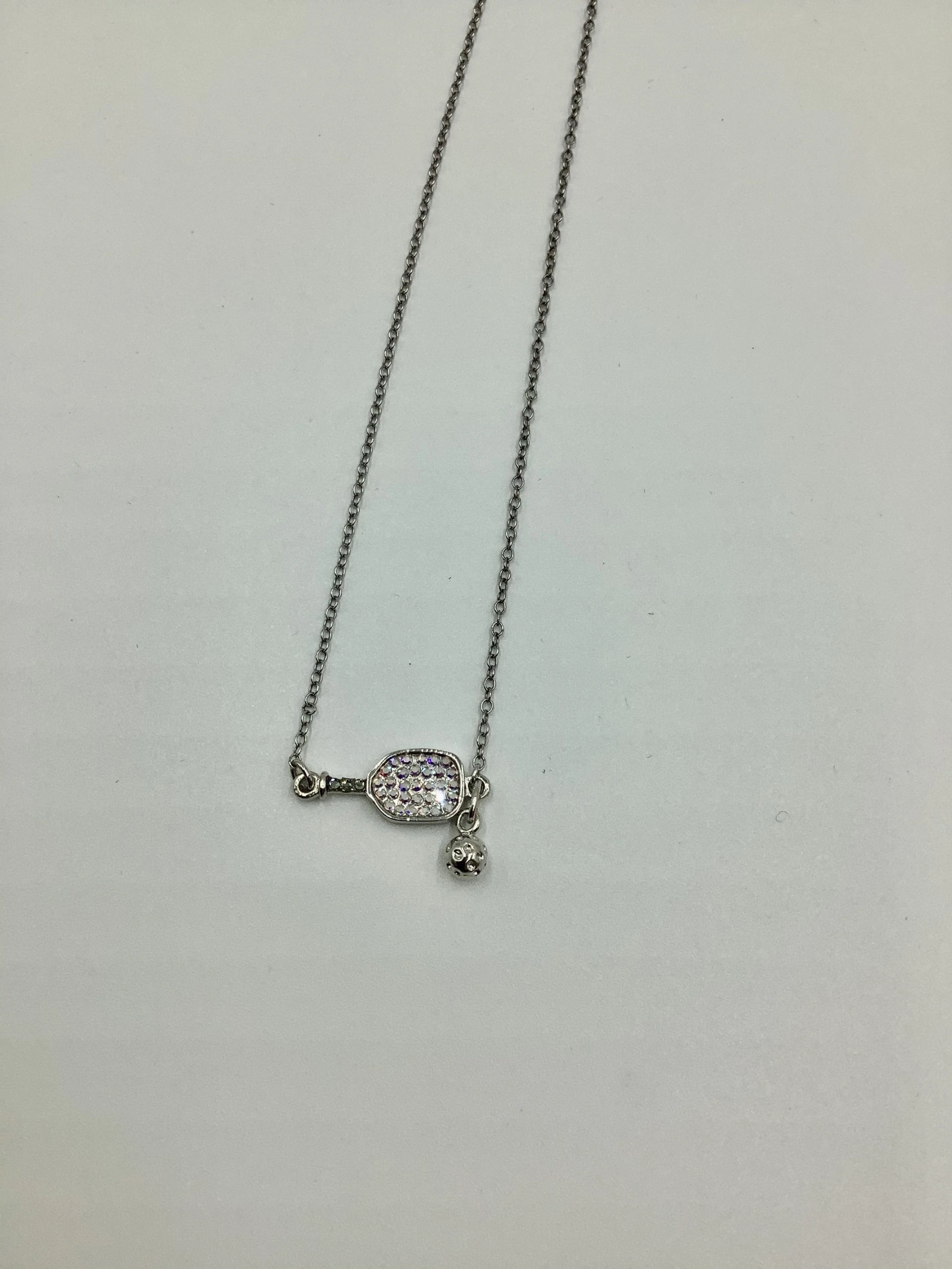Small, sideways crystal pickleball paddle and ball on 16″ sterling silver chain