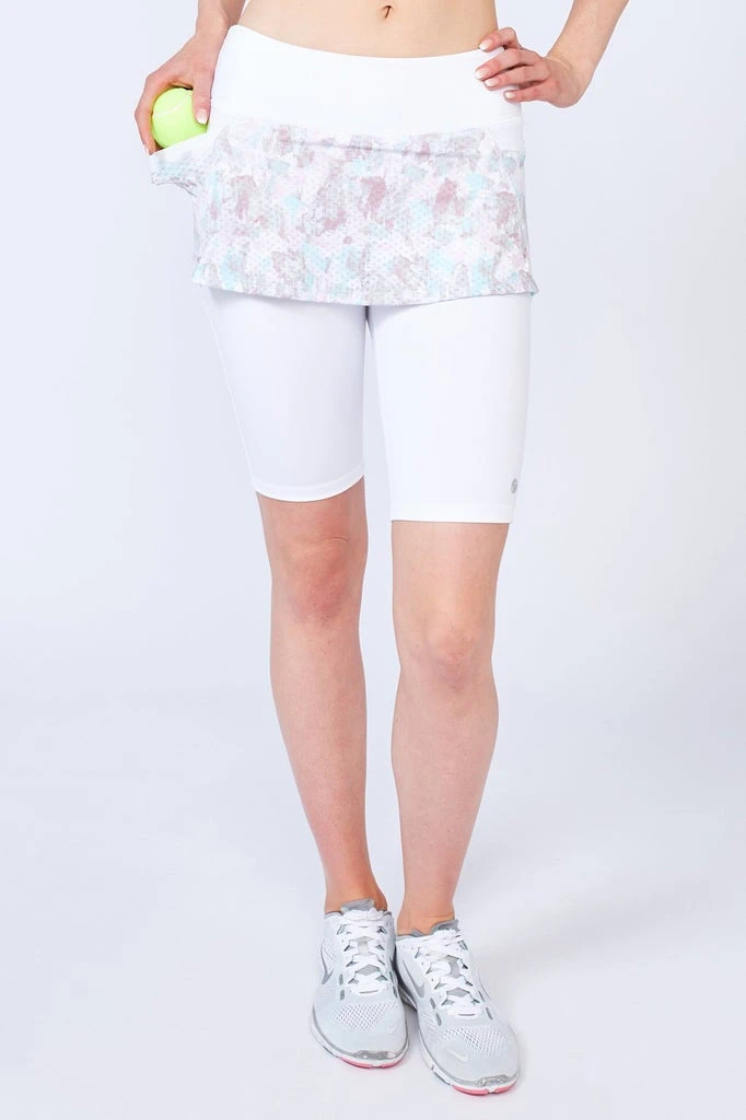 We wanted to create a style that embraced both style & function. The bike shorts hit above the knee with a 10″ inseam. We added the 12″ print mesh skort to make it more tennis friendly as well as for those that want more booty coverage. It has two side storage pockets also in mesh fabric. This is a perfect style for all your active pursuits.